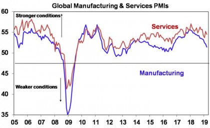 The problem now is that while some of the worries from last year have faded, global growth looks to be continuing to slow. Particularly disappointing in this regard were March business conditions PMIs which showed falls in the US and Europe and continuing weakness in Japan (and Australia).